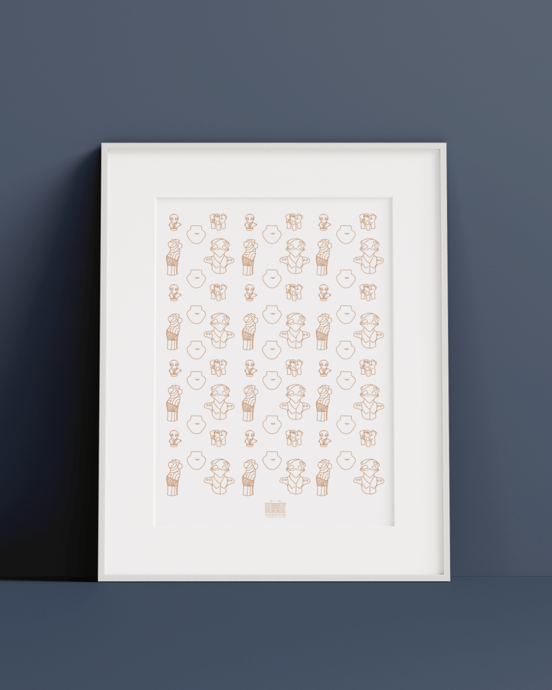 Принт са мотивом археолошких предмета из колекције праисторије Народног музеја у Смедеревској Паланци, са локалитета Медведњак, датованих у млађу фазу винчанске културе (4.500 – 4. 000 п.н.е.) штампан на специјалном папиру. Долази без рама у формату А4. Дизајнирано и произведено у Србији.