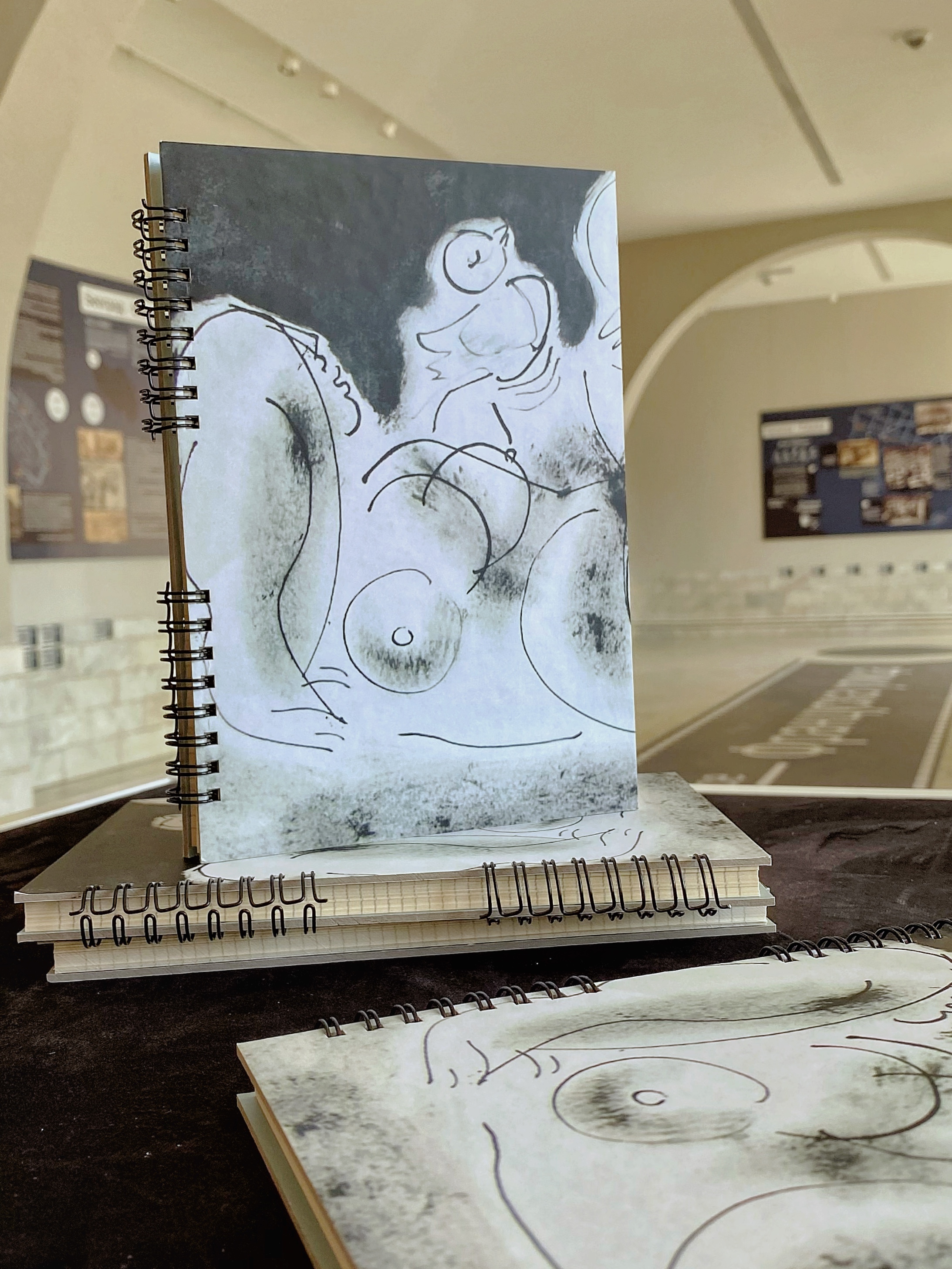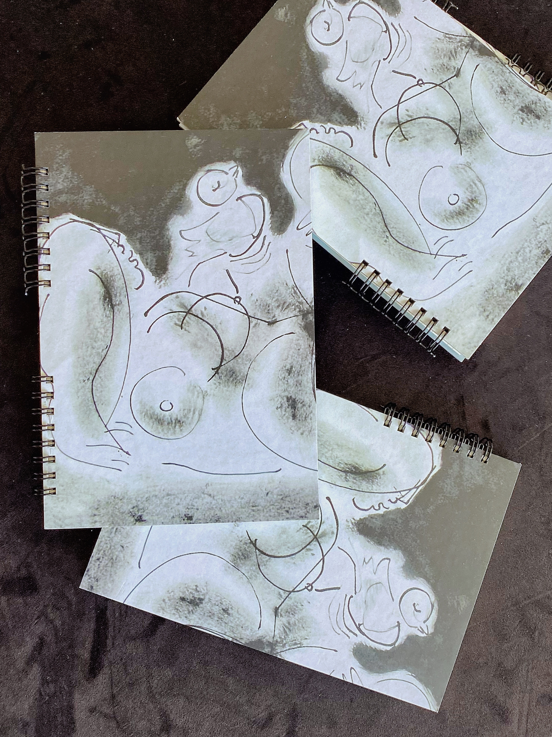 Нотес беж боје са репродукцијом дела са репродукцијом дела „Два акта са птицом“ Милоша Бајића, датираним у 1974. годину, из ликовне колекције Нардоног музеја у Смедеревској Паланци. Дизајнирано и произведено у Србији.