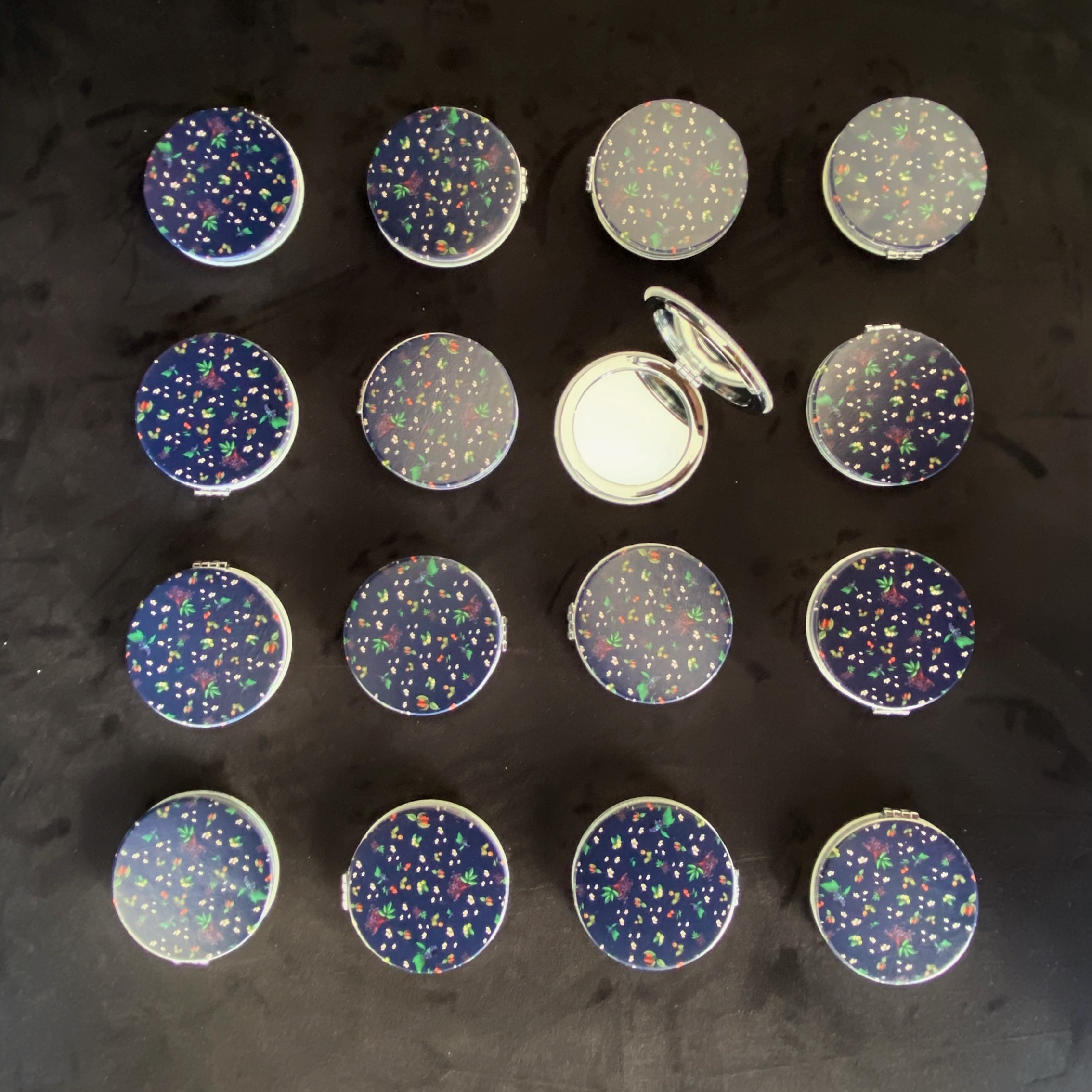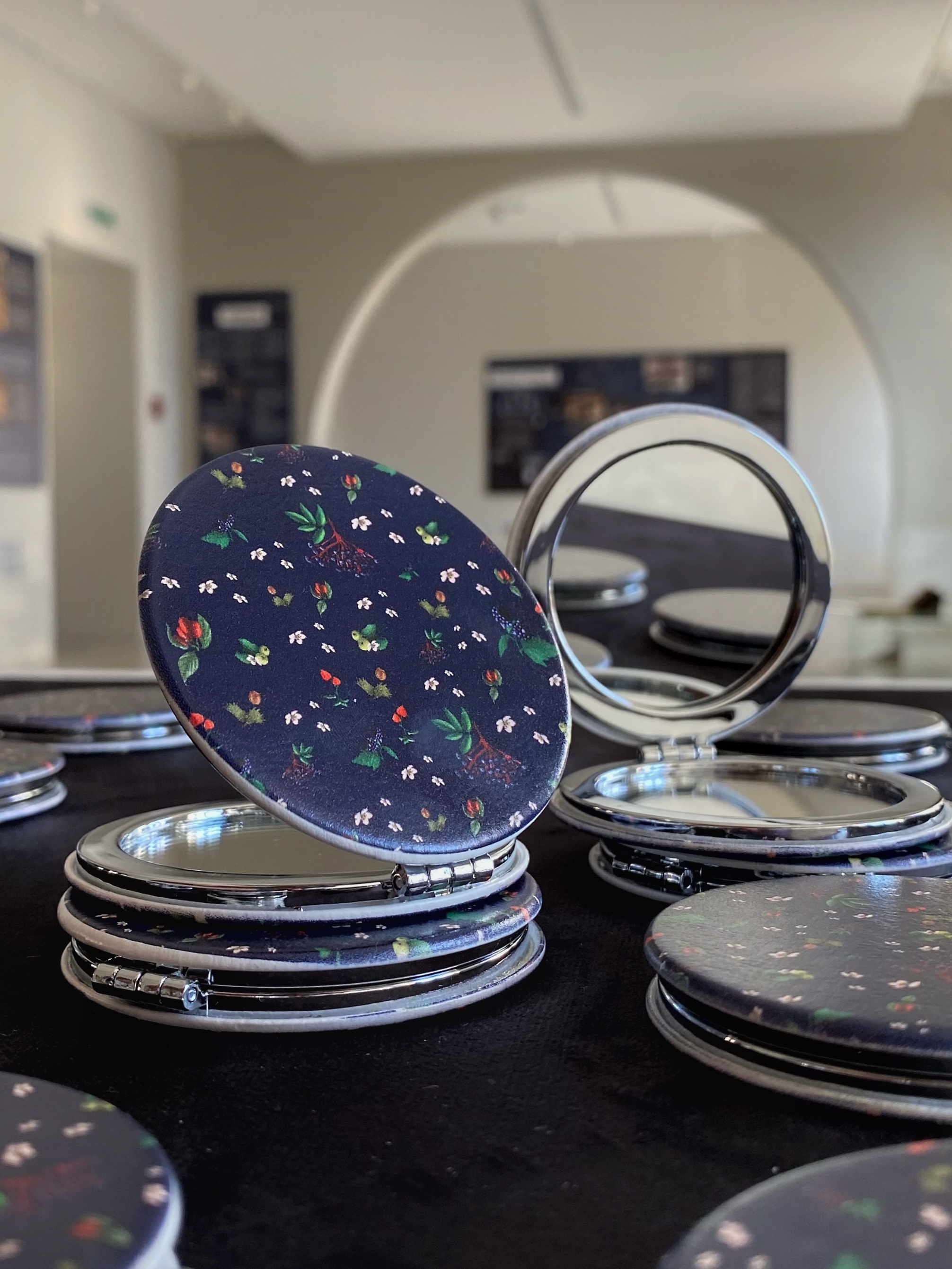 Џепно увеличавајуће огледало на склапање са мотивом биљака чији су остаци откривени током ископавања локалитета винчанске заједнице,  Селевац Старо Село. Дизајнирано и произведено у Србији.