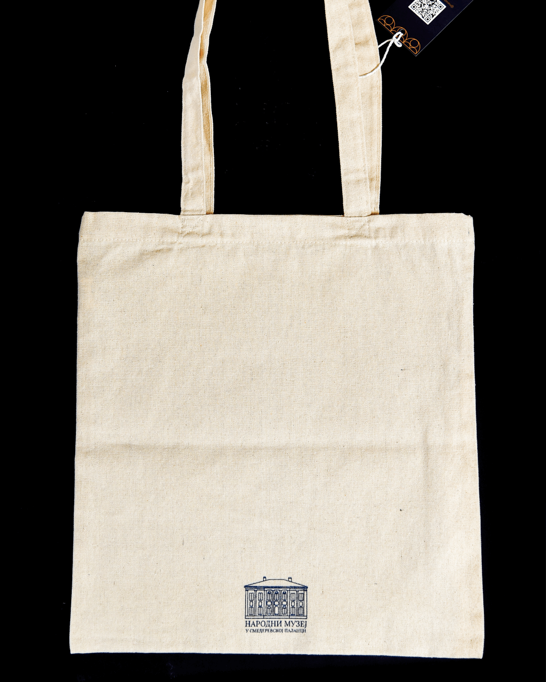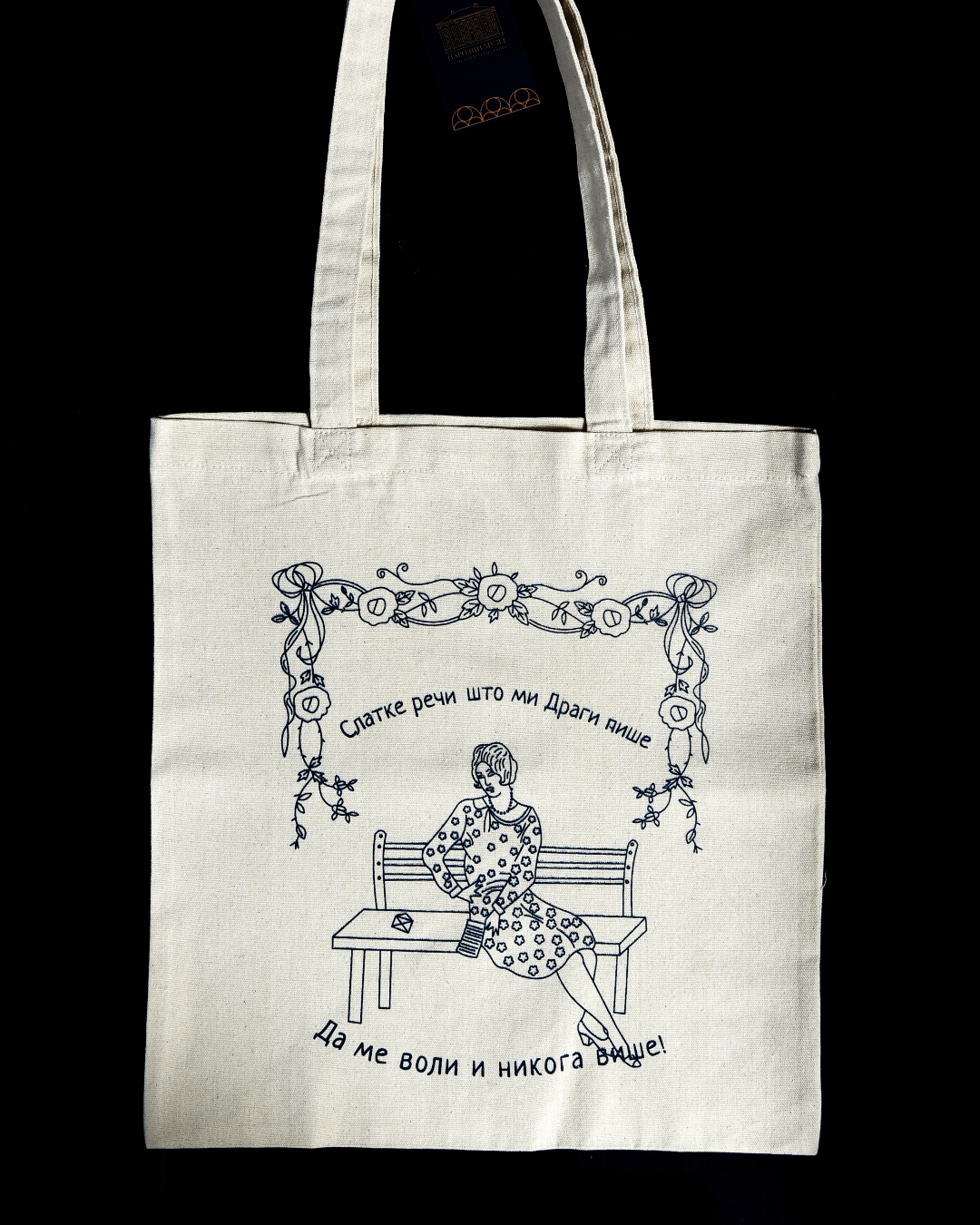 Ланени цегер, беж боје, са мотивом дозиднице/куварице са везеним текстом „Слатке речи што ми драги пише Да ме воли и никога више“ на белом платну из етнолошке колекције Народног музеја у Смедеревској Паланци, датована у почетак 20. века. Дизајнирано и произведено у Србији.