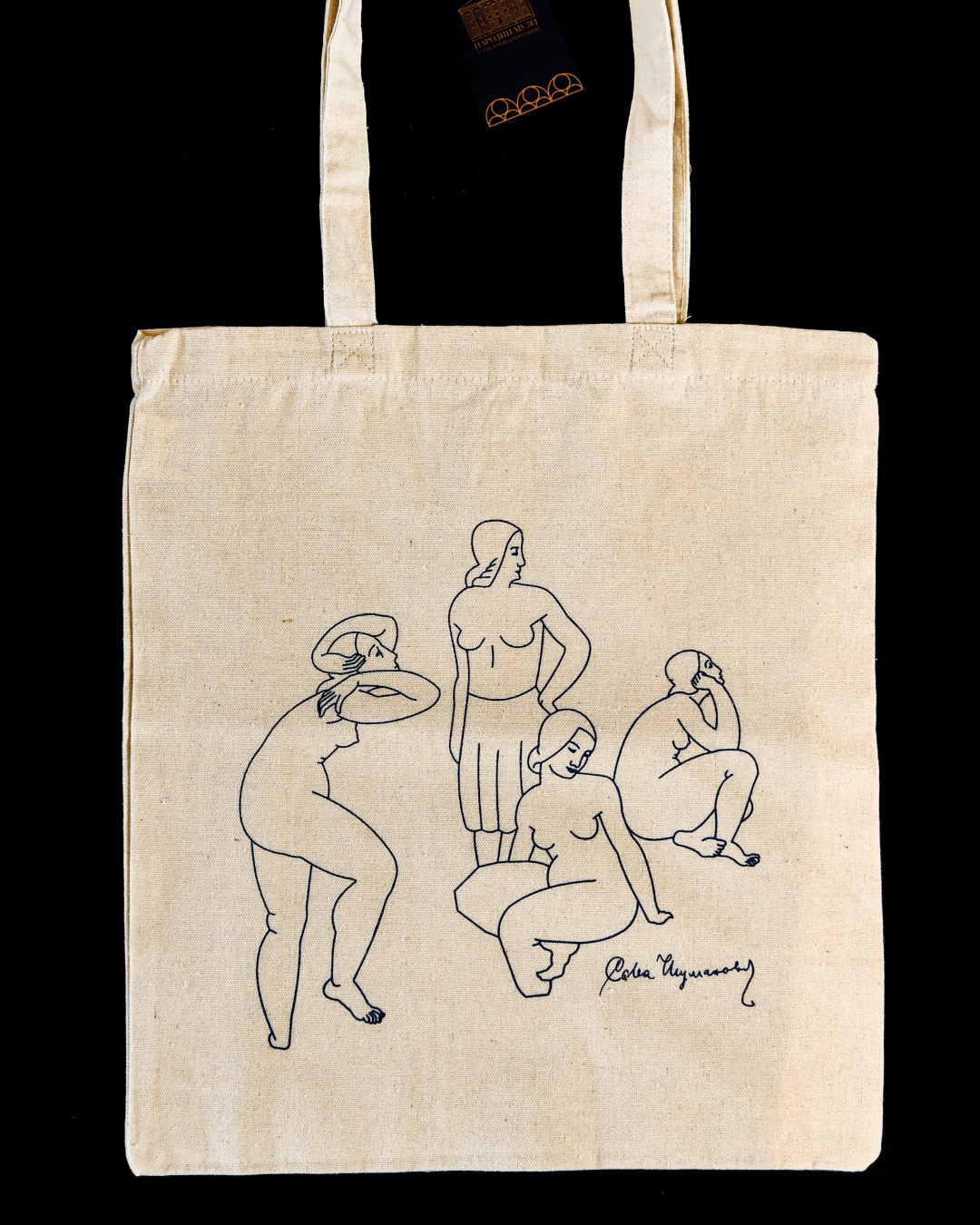 Ланени цегер, беж боје са мотивом дела „Купачице“ Саве Шумановића, недатирано, из ликовне колекције Народног музеја у Смедеревској Паланци. Дизајнирано и произведено у Србији.