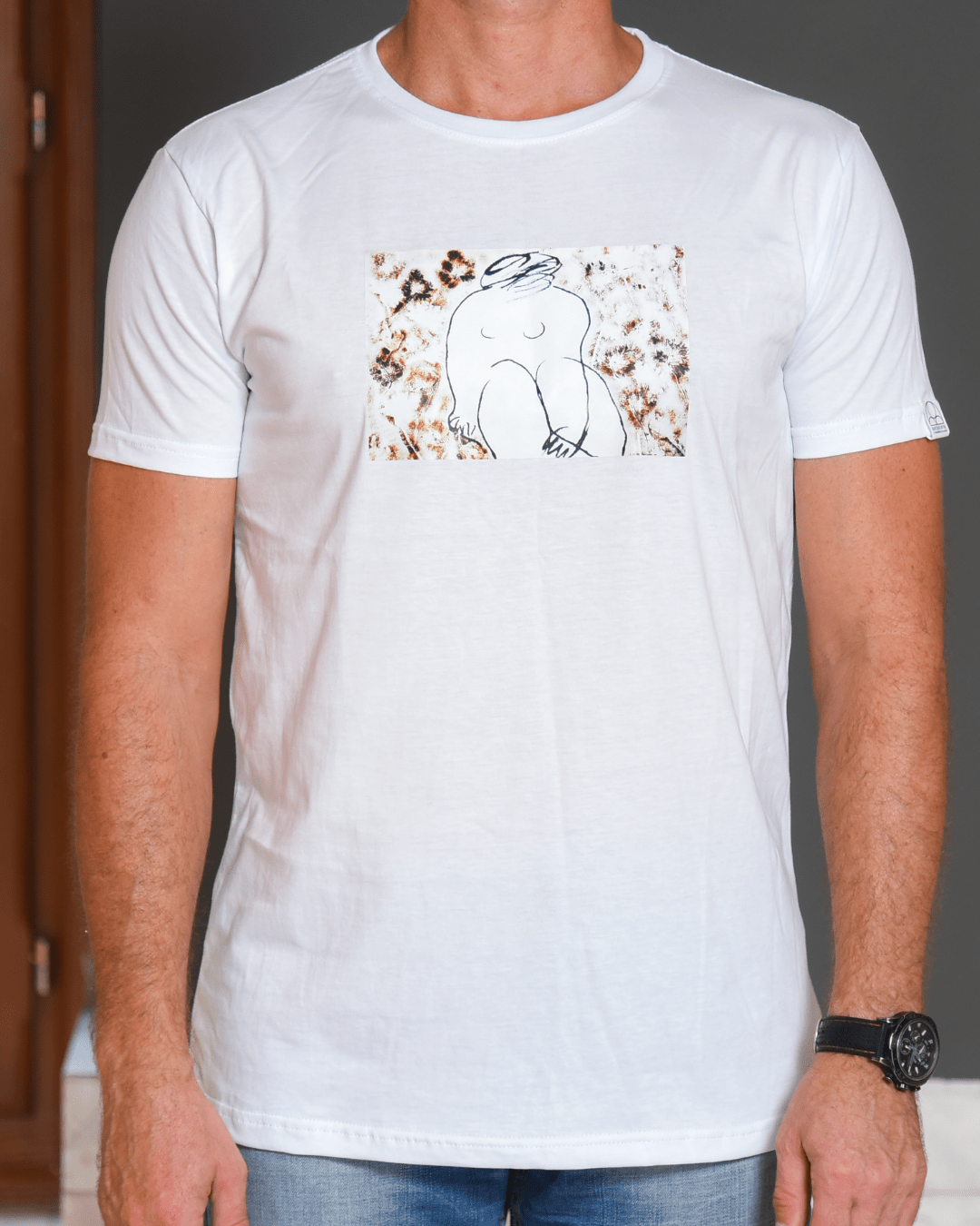 Бела, памучна, мушка мајица са репродукцијом дела „Акт у шуми“ Милоша Бајића, датираним у 1972. годину, из ликовне колекције Народног музеја у Смедеревској Паланци. Дизајнирано и произведено у Србији.