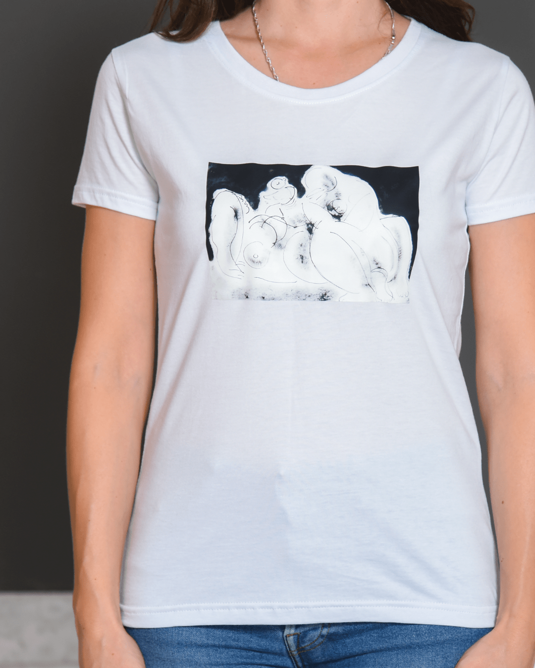 Бела, памучна, женска мајица са репродукцијом дела „Два акта са птицом“ Милоша Бајића, датираним у 1974. годину, из ликовне колекције Нардоног музеја у Смедеревској Паланци. Дизајнирано и произведено у Србији.