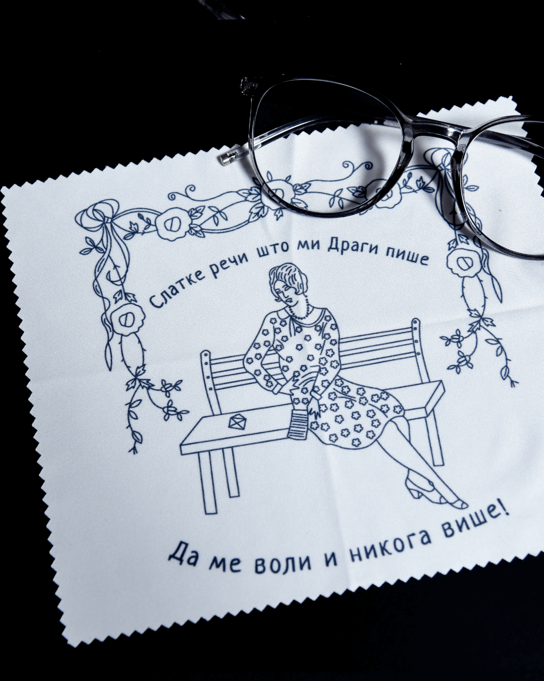Микрофибер крпица за чишћење и брисање стакала са мотивом дозиднице/куварице са везеним текстом „Слатке речи што ми драги пише Да ме воли и никога више“ на белом платну из етнолошке колекције Народног музеја у Смедеревској Паланци, датована у почетак 20. века. Дизајнирано и произведено у Србији.